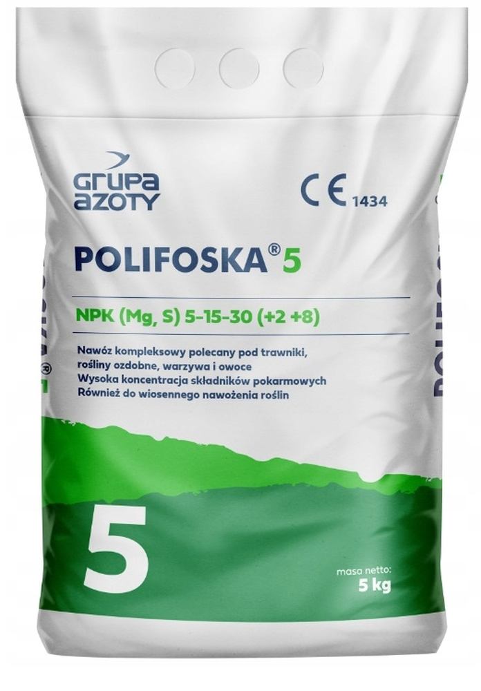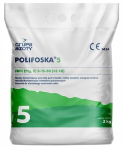 Skład: Azot 5% (N), Fosfor 15% (P2O5), Potas 30% (K2O), Magnez 2% (MgO), Siarka 8% (SO3) Wydajność: Opakowanie 2 kg wystarczy na 200 m2. Cechy: Granulowany nawóz Polifoska 5 stosowany do wszystkich roślin uprawnych: od zbóż, przez warzywa i rośliny zielone. Jest zalecany do użycia w przypadku gleb ubogich w potas oraz magnez. Nawóz NPK 5-15-30 z dodatkiem magnezu i siarki zapewnia roślinom prawidłowy rozwój, usprawniony system korzeniowy, odporność na działanie niekorzystnych warunków atmosferycznych oraz wysoką jakość plonów. Zawiera 5% azotu w formie amonowej, przez co pierwiastek nie ulega wymywaniu z gleby i przyczynia się do szybszego wzrostu plonów. Dobrze przyswajalny fosfor w proporcji 15% zapewnia dobre ukorzenienie się roślin. Korzystny jest także dodatek niezbędnego w procesie fotosyntezy magnezu oraz siarki, która poprawia wartość biologiczną plonu. Zalety: Nawóz nietoksyczny i bezzapachowy Równomierne granulki do wymieszania z glebą Łatwo przyswajalne składniki Granulki są powlekane i nie zbrylają się trwale Do szerokiego i uniwersalnego zastosowania: do roślin ogrodowych, domowych, balkonowych, iglaków, trawników, kwiatów, warzyw, owoców, ziół, a nawet zbóż Wieloskładnikowy nawóz NPK (MgS) 5-15-30 (+2+8) Klasa ziarnowa 2-5 mm, co najmniej 92%